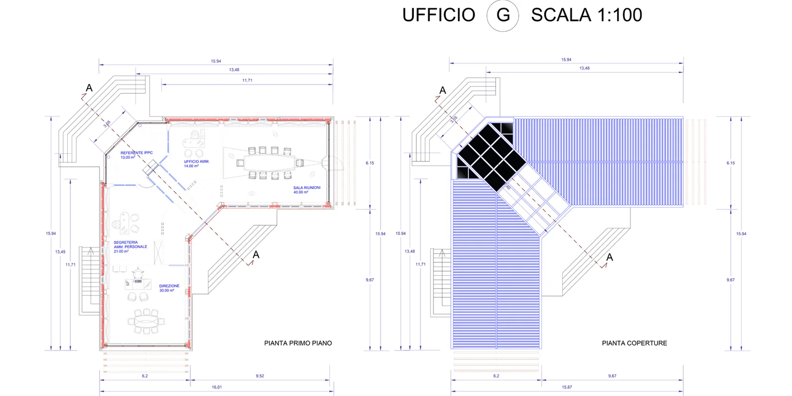 (nelle illustrazione bisogna togliere la n.6, 7, 8, 9) Uno spazio pensato, su tre livelli, per più categorie di fruitori: dai dipendenti lavoratori dell'impianto, ai fruitori e clienti, dalla Direzione tecnica al Team di Ricerca e Sviluppo connesso all'attiguo laboratorio della Serra Olandese. Le vetrate ampie insistono sui fronti interni verso il giardino a Nord e Ovest; i fronti verso Est e Sud sono pressoché opachi ad esclusione di piccol