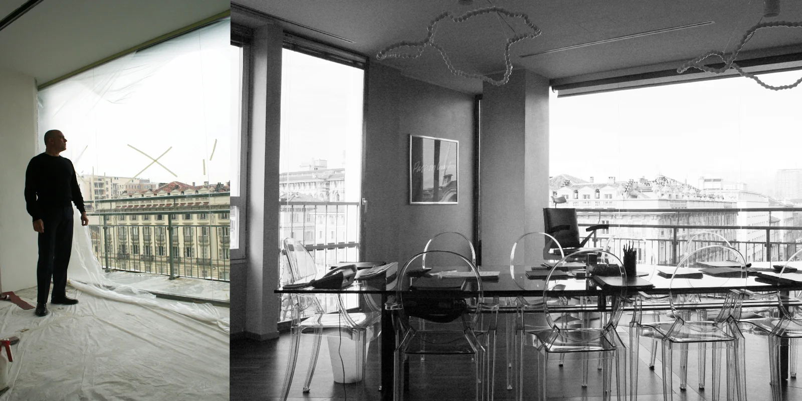 Partendo dalla splendida vista che si ha dalle vetrate ampie e moderne della Torre, lo spazio interno è stato tagliato e suddiviso in base alla luce diurna nel suo variare. Tutte le pareti cosi come le porte sono in lastre di vetro stratificato di sicurezza opalescente. Entrando si è pervasi dalla luce. Dal pavimento in doghe di legno scuro, emergono delle fasce metalliche che corrono verso la luce. I pilastri esistenti vengono resi dei cilindri su cui stampare vecchie immagini della Torre.