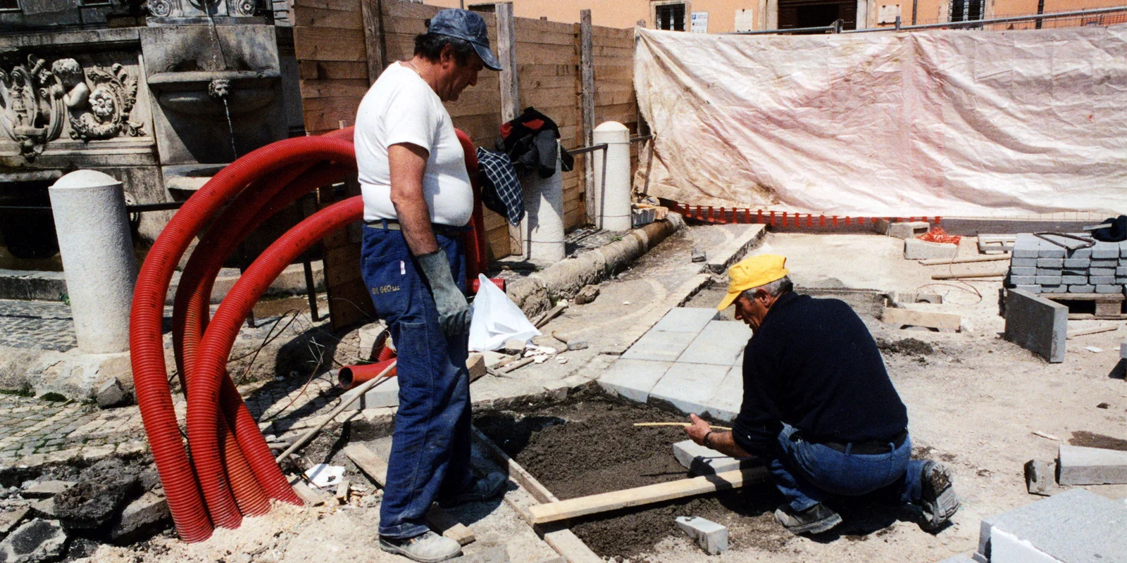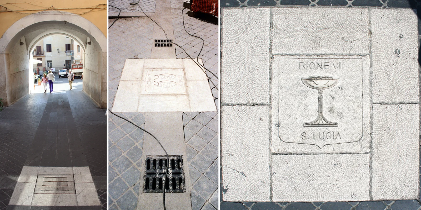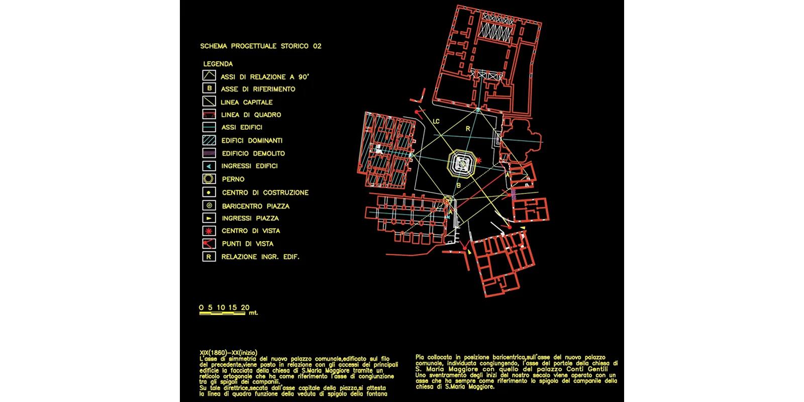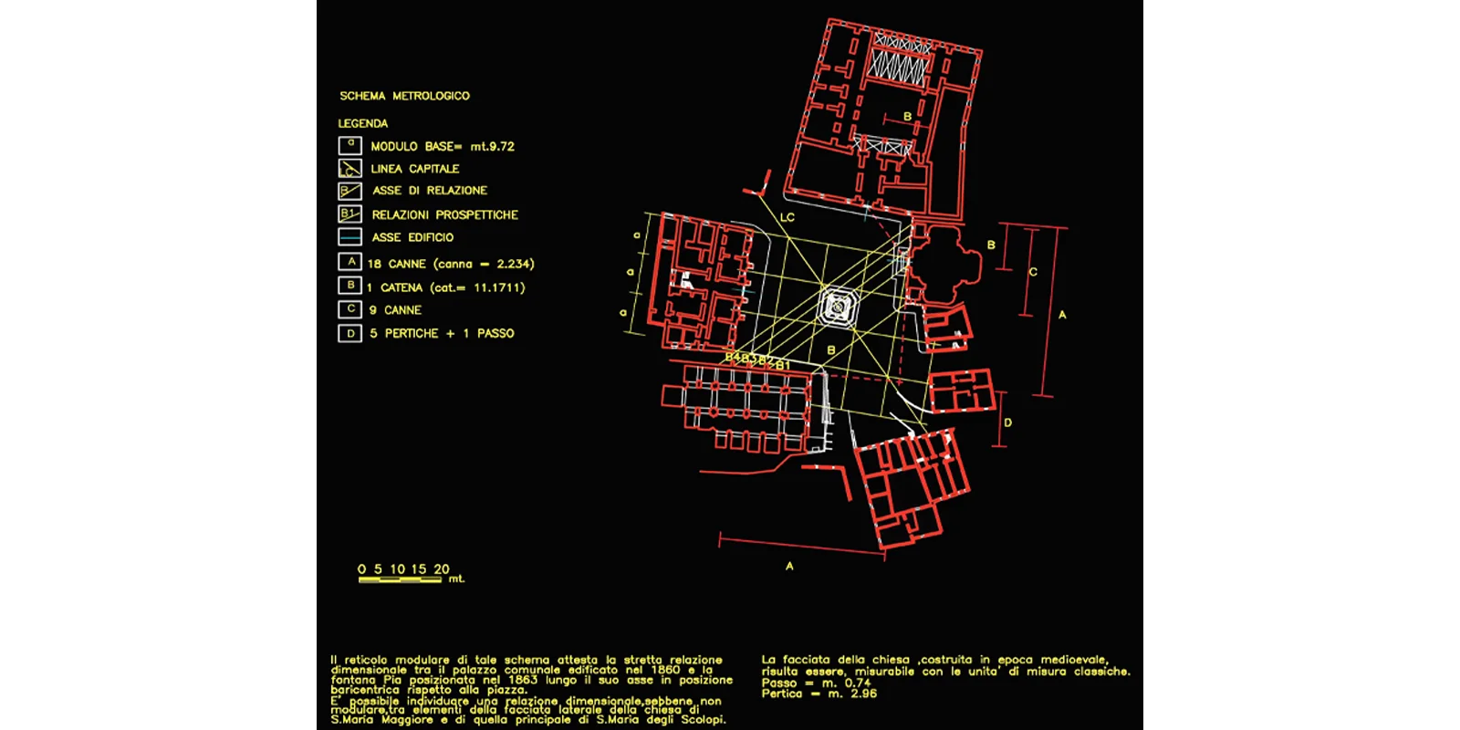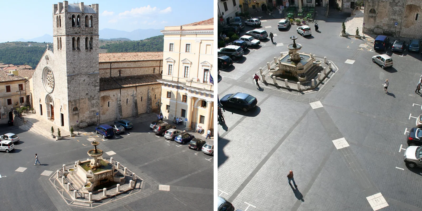Il progetto muove dall'impianto diagonale della piazza per tessere la trama della pavimentazione direttamente da i rapporti metrici che legano le diverse architetture del contorno. In questo contesto i due edifici contigui del Municipio e Conti Gentili segnano l'ingresso diagonale, la soglia oltre la quale ci si trova nell'invaso. Elemento unificante degli edifici la pavimentazione della piazza, sorta di tessuto geometrico, generato dalla suddivisione del modulo base di 9,72 ml, in cui i fili immateriali delle diverse assialità si regolarizzano in fasce di pietra calcare (larghe 60 cm) inframezzate da basaltina messa in opera a correre (per una larghezza di 4,26) in direzione della linea capitale (anch'essa in pietra calcare). La linea capitale in prossimità della fontana Pia si biforca determinando un vasto campo prospettico aperto segnato dai ricorsi di pietra calcare che abbracciano con il loro andamento il sagrato della chiesa di Santa Maria Maggiore e il sagrato della chiesa di Santa Maria degli Scolopi.