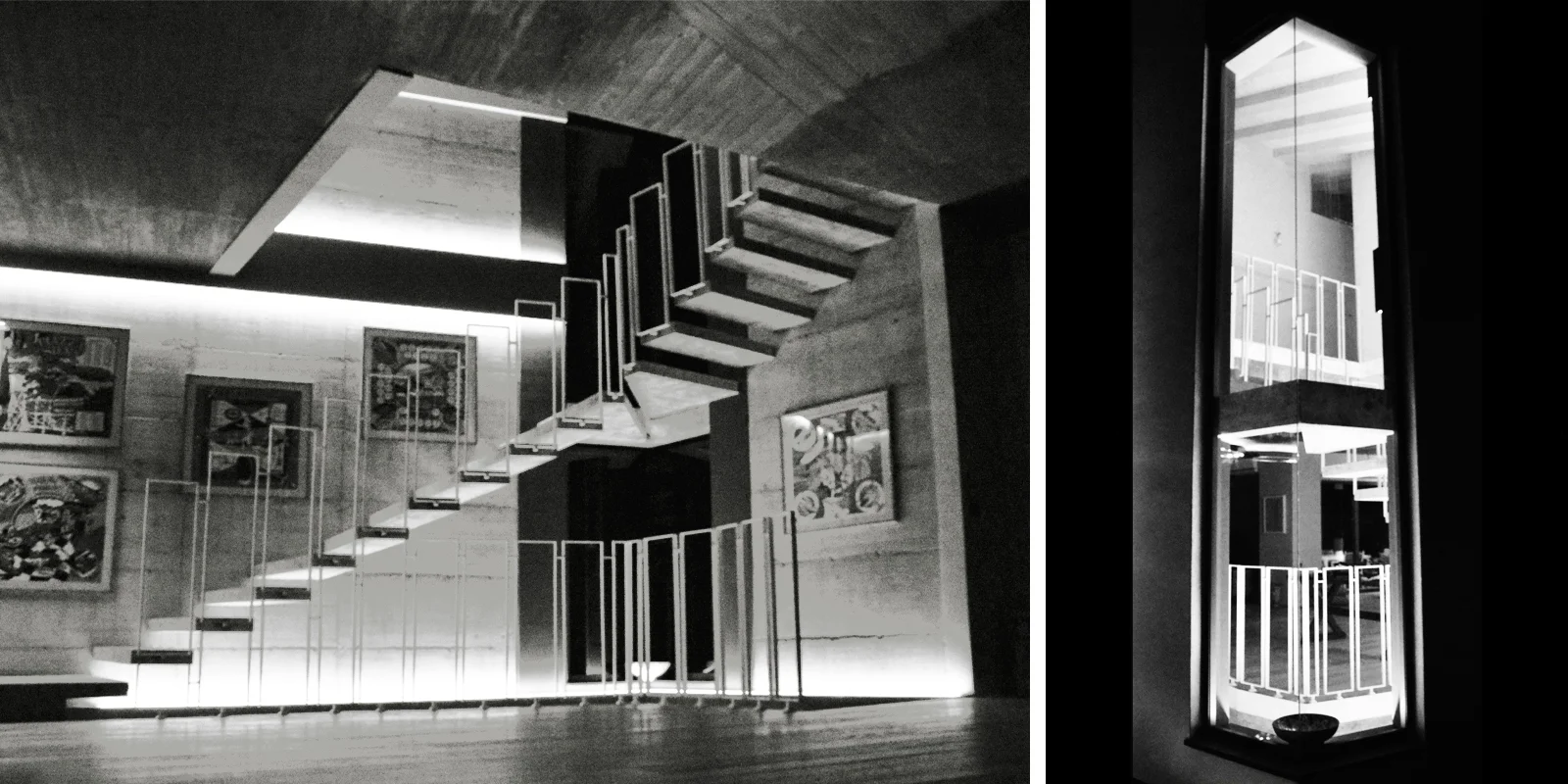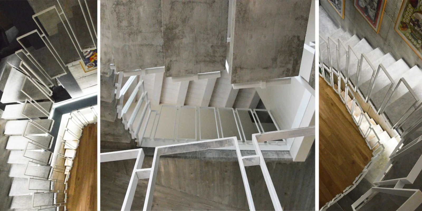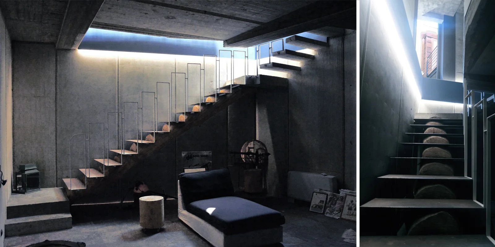 La scala nel punto d'inizio ha due gradini in c.a. lisciato. La sua geometria in pianta si sviluppa lungo i lati che determinano un angolo di 105 gradi. Salendo dal livello più basso, dopo due gradini, si cambia direzione e ci si avvia verso il tratto lineare costituito da un tronco monumentale di castagno, a cui sono fissati le pedate in lamiera di ferro ossidata e cerata da 6 mm. In prossimità dell'angolo, dove insiste il taglio di luce dell'edificio, la scala, cambia direzione, e cambia anche la sua struttura che si trasforma in tante mensole a sbalzo, di c.a. a vista, sino a giungere al livello intermedio della zona giorno. Per raggiungere il secondo livello, la scala replica la successione di mensole. Dette mensole, incastrate sul lato dei setti in cemento armato faccia a vista, vengono tagliate, sul lato corto verso il vuoto, a seguire l'andamento della linea spezzata aperta. La balaustra è costituita da piattine di ferro, larghe 2 cm e spesse 4 mm., saldate a formare tanti telai rettangolari quanti sono i gradini.