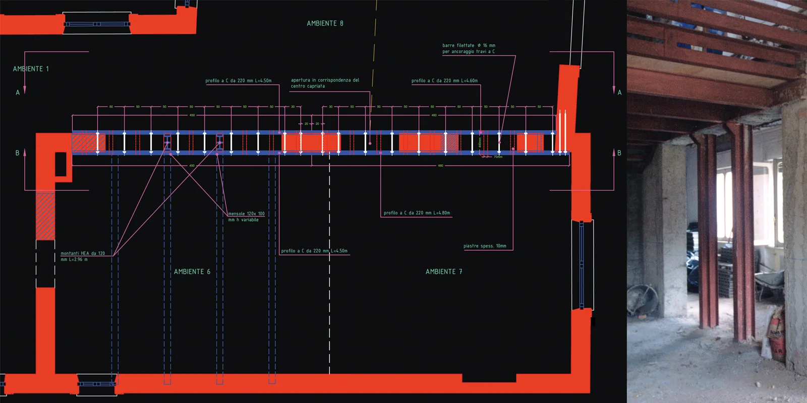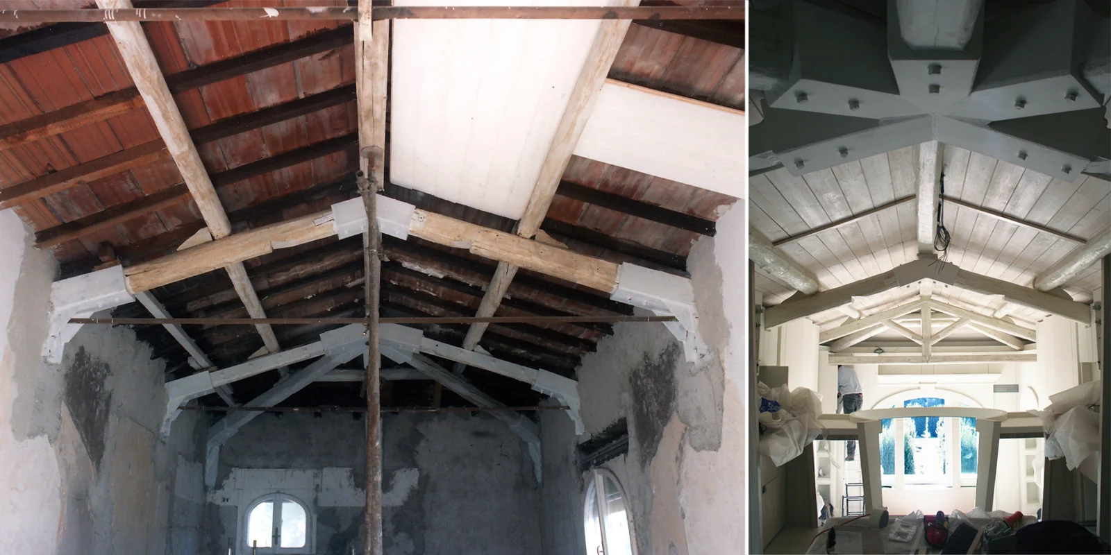 La prima opera ha riguardato l'apertura di tre vani sul muro di spina attraverso la costituzione di una trave a sandwich costituita da due strati resistenti, profili metallici a U distanziati tra loro e collegati rigidamente ad un elemento connettivo, in questo caso il tufo. La struttura così composta ha un comportamento statico notevolmente migliore delle singole parti da cui è costituita. La seconda opera ha interessato le capriate con il relativo taglio delle catene. Taglio che ha comportato la realizzazione di staffe a camicia nel punto di appoggio delle capriate, collegate alla catena ribassata alla quota del nuovo livello del soppalco.