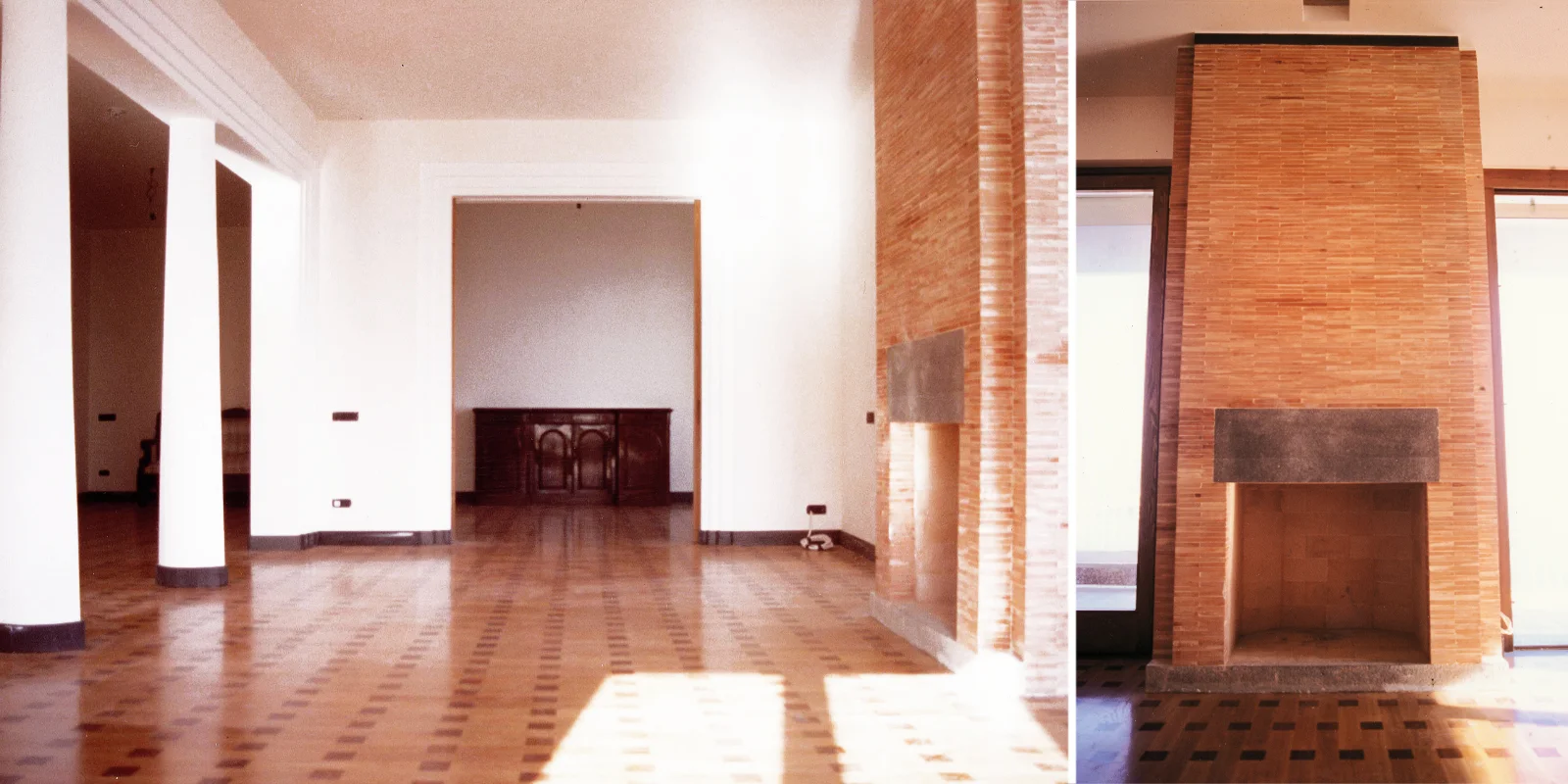 Lo spazio è concepito come un arco (il muro che separa la cucina dalla zona giorno), in procinto di scoccare le frecce (le due colonne a mandorla) verso l'orizzonte marino. Un camino, in mattoncini di cotto, bordati alle estremità e sull'architrave della bocca, con piperno finemente bocciardato, si erge solido tra due porte finestre scorrevoli che danno accesso alla balconata sul golfo di Napoli. Un tappeto di geometrie quadrate di legno scuro e chiaro è la pavimentazione, così come il mobile della sala pranzo di legno e vetro scannellato. Una porta scorrevole a scomparsa di rovere e vetro, collega il pranzo con il soggiorno. Delle modanature rettilinee a fasce continue segnano le grandi aperture di comunicazione dello spazio. Una scala elicoidale a sbalzo in struttura di piastre di ferro tagliate e sagomate inanellate su palo in tubolare di ferro con pedate in tavole di rovere tagliate e assemblate.