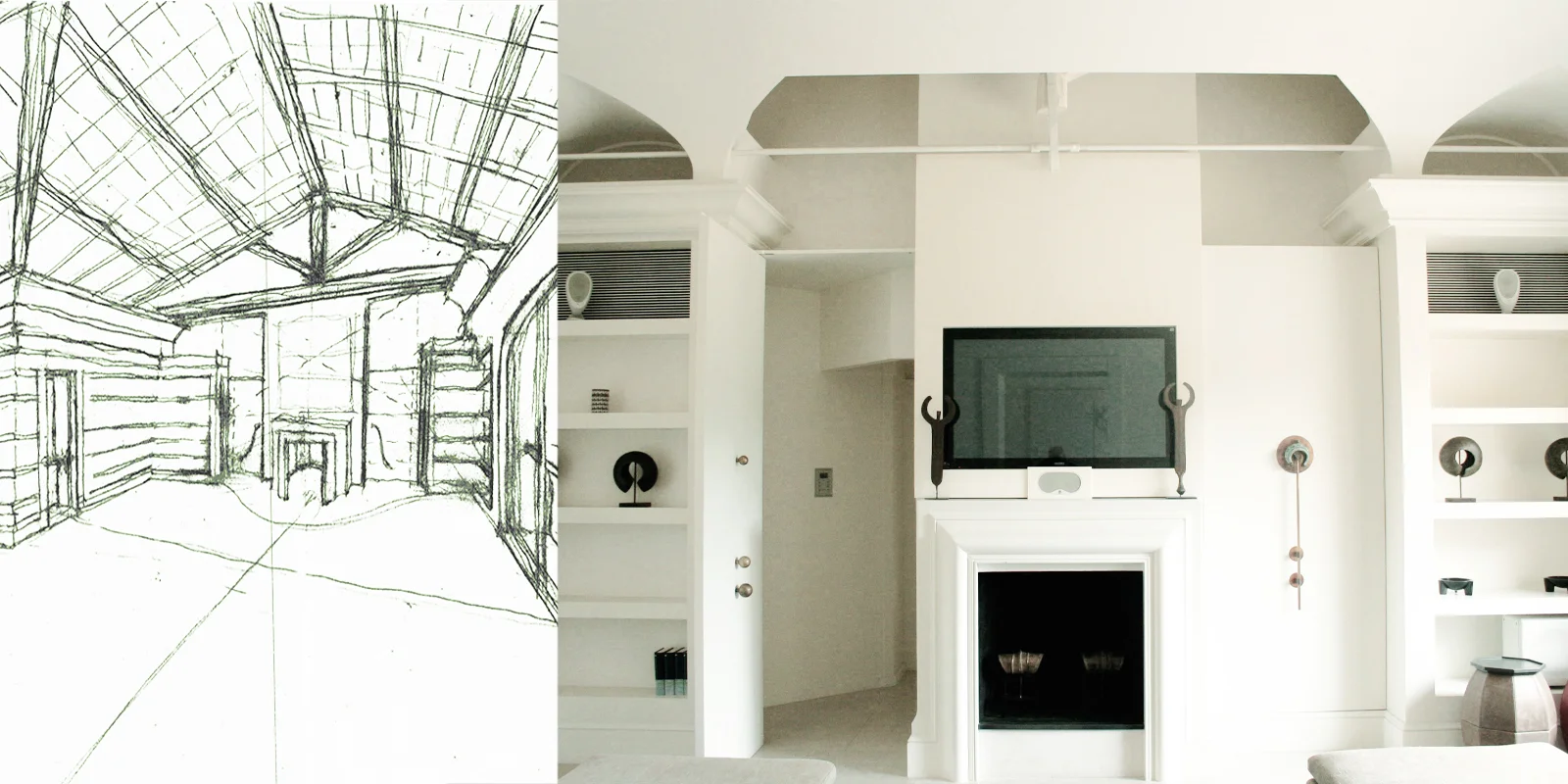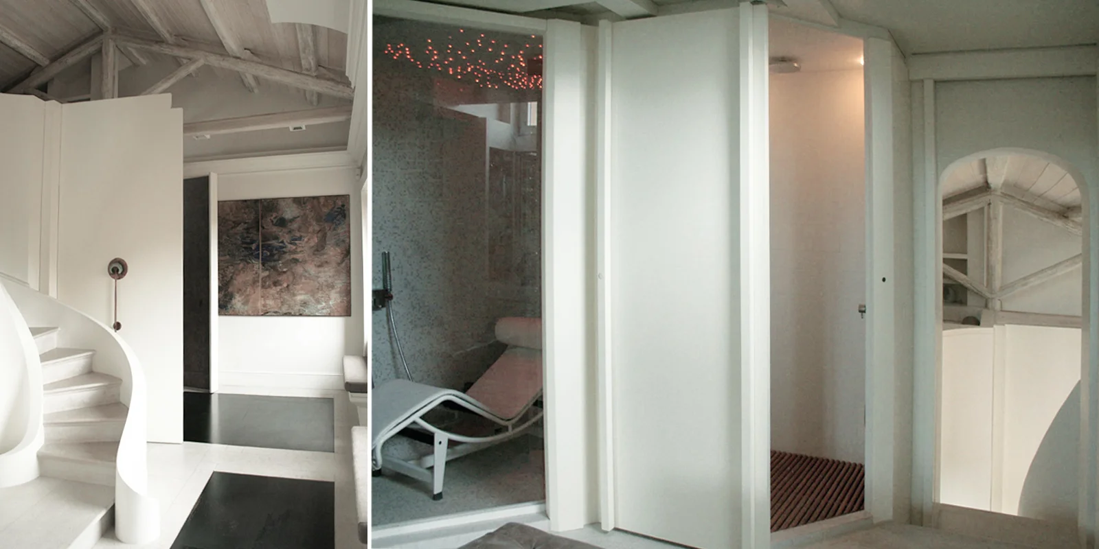 L'intervento si caratterizza per la dialettica tra involucri diversi: il primo quello della pelle originaria del manufatto in cui sono percepibili le strutture originarie lignee, il secondo il nuovo guscio, creato all'interno, classico e sobrio, ispirato dalle linee decorative delle modanature esterne e dal giardino all'italiana prospicente la villa.