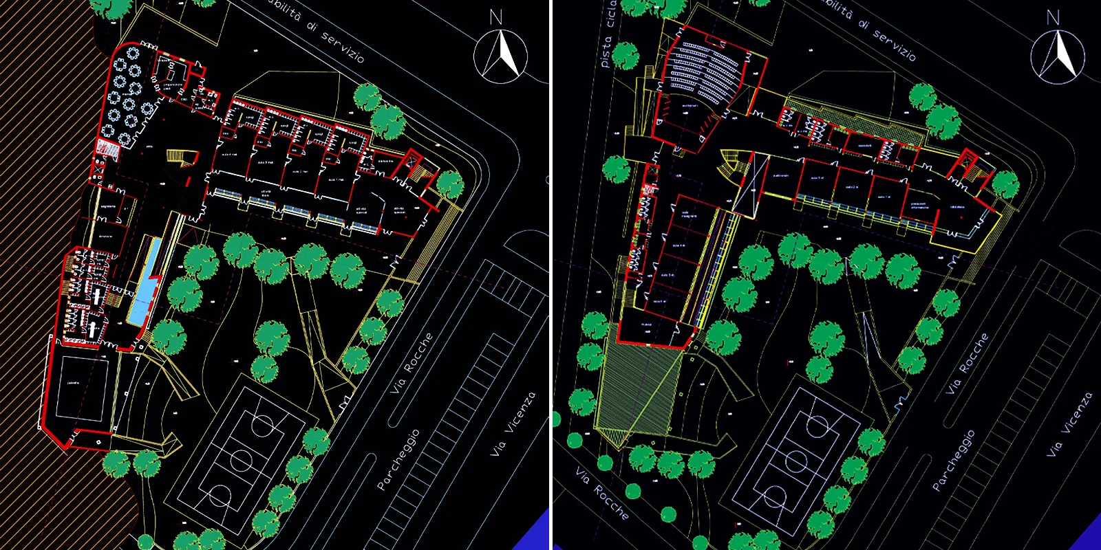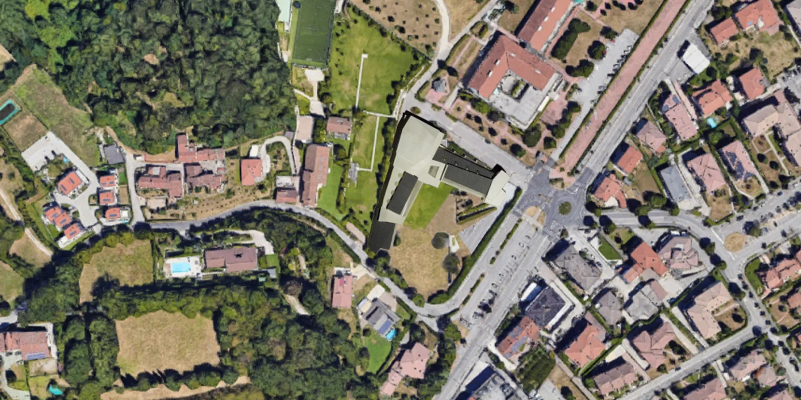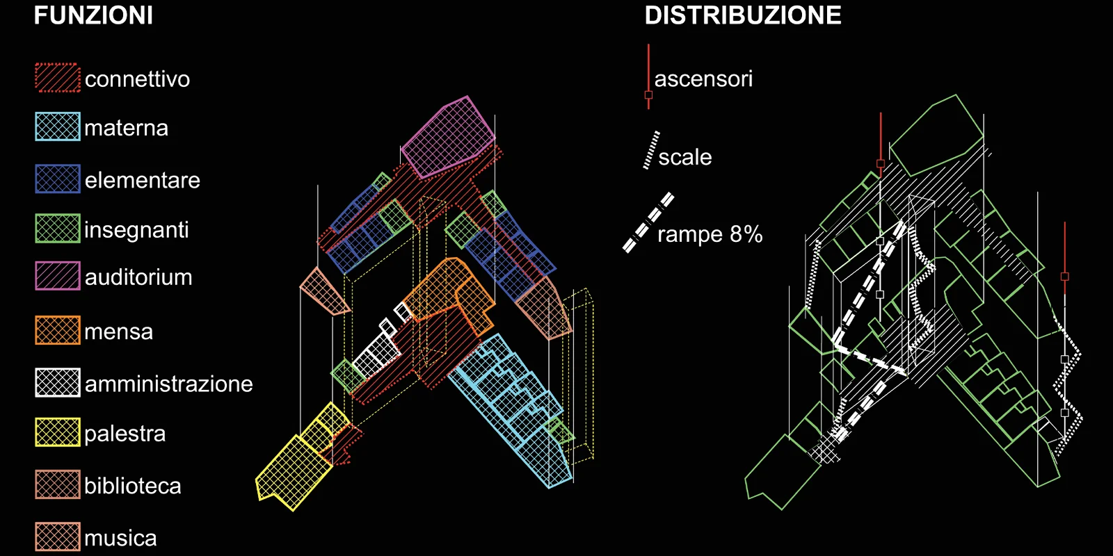 L'architettura in un contesto frammentario cerca il radicamento con la morfologia del sito: ai piedi di una collina dolcemente degradante a valle. La conformazione del lotto trapezoidale ha consentito di sviluppare la costruzione sui due lati Nord, Est. Questo, oltre a preservare l'area centrale a giardino, area giochi e parcheggio, ha consentito di distribuire le aule e i laboratori verso Sud e Ovest, attraverso gallerie vetrate, vere serre con dispositivi automatici di regolazione dell'ombreggiamento, che funge da termoregolatore con l'ausilio di piante e vasche d'acqua. Le vetrate sono stratificate di sicurezza atte a contenere le celle fotovoltaiche.