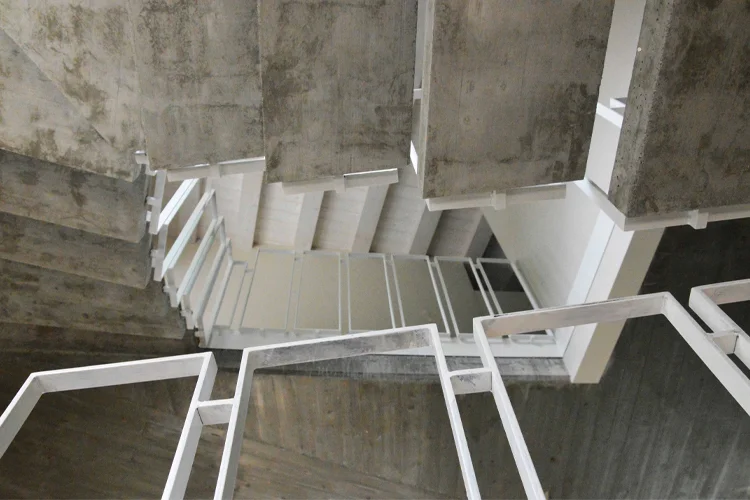 La escalera de Garlenda conecta tres niveles: el sótano, la planta de día y la planta de noche. La idea se basa en el contraste estático entre el principio de la viga simplemente apoyada (primer tramo) y el principio del voladizo en ménsula (segundo tramo).