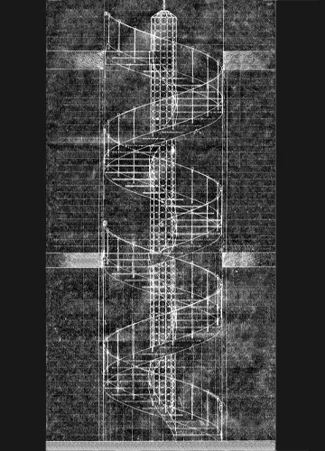 La escalera de caracol circular está contenida en una estructura de muros de hormigón armado que forman los tres lados que la estabilizan. Estos muros, salvo en la cimentación y la cubierta, se interrumpen a lo largo de la bisectriz para permitir la entrada de luz natural.