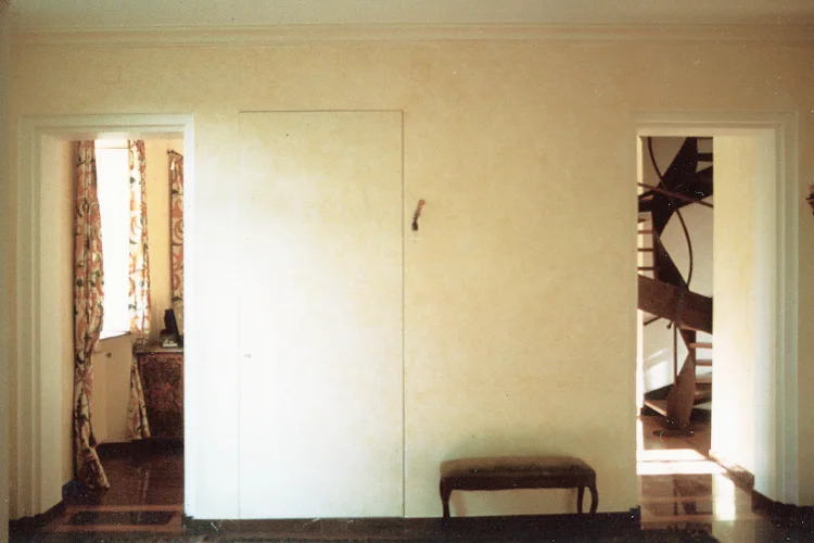La escalera está situada en una villa del siglo XVIII que, durante el siglo pasado, fue objeto de trabajos de consolidación estructural. La intervención incluyó el corte/arosado del forjado y la inserción de un pórtico de acero con perfiles HEA.