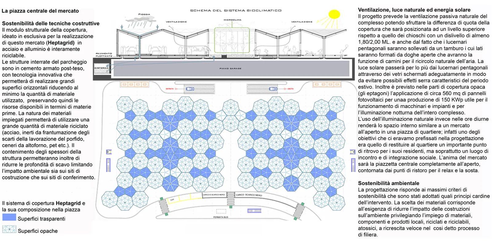 Il progetto è nato con la fattiva collaborazione dei cittadini e degli operatori del mercato con l'intento di porre fine al degrado dell'area ridefinendola come vera e propria piazza del mercato rionale. La sinergia economico finanziaria creata con la società che avrebbe gestito il sottostante parcheggio per 330 posti auto, avrebbe permesso la disponibilità di fondi per il 70% dell'opera