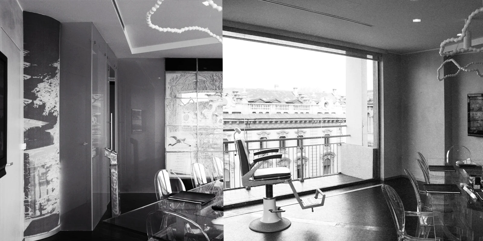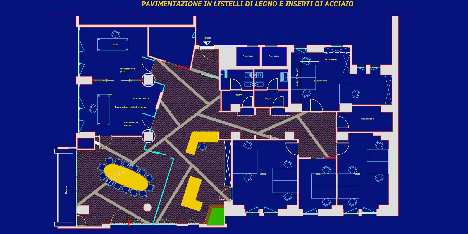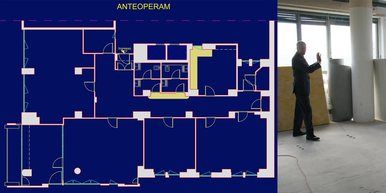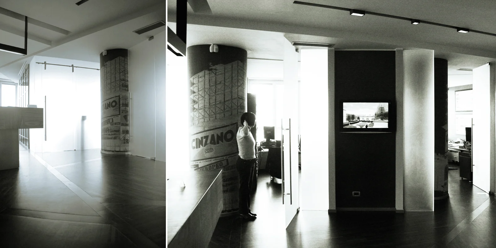 Partendo dalla splendida vista che si ha dalle vetrate ampie e moderne della Torre, lo spazio interno è stato tagliato e suddiviso in base alla luce diurna nel suo variare. Tutte le pareti cosi come le porte sono in lastre di vetro stratificato di sicurezza opalescente. Entrando si è pervasi dalla luce. Dal pavimento in doghe di legno scuro, emergono delle fasce metalliche che corrono verso la luce. I pilastri esistenti vengono resi dei cilindri su cui stampare vecchie immagini della Torre.