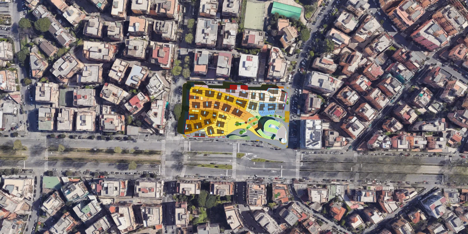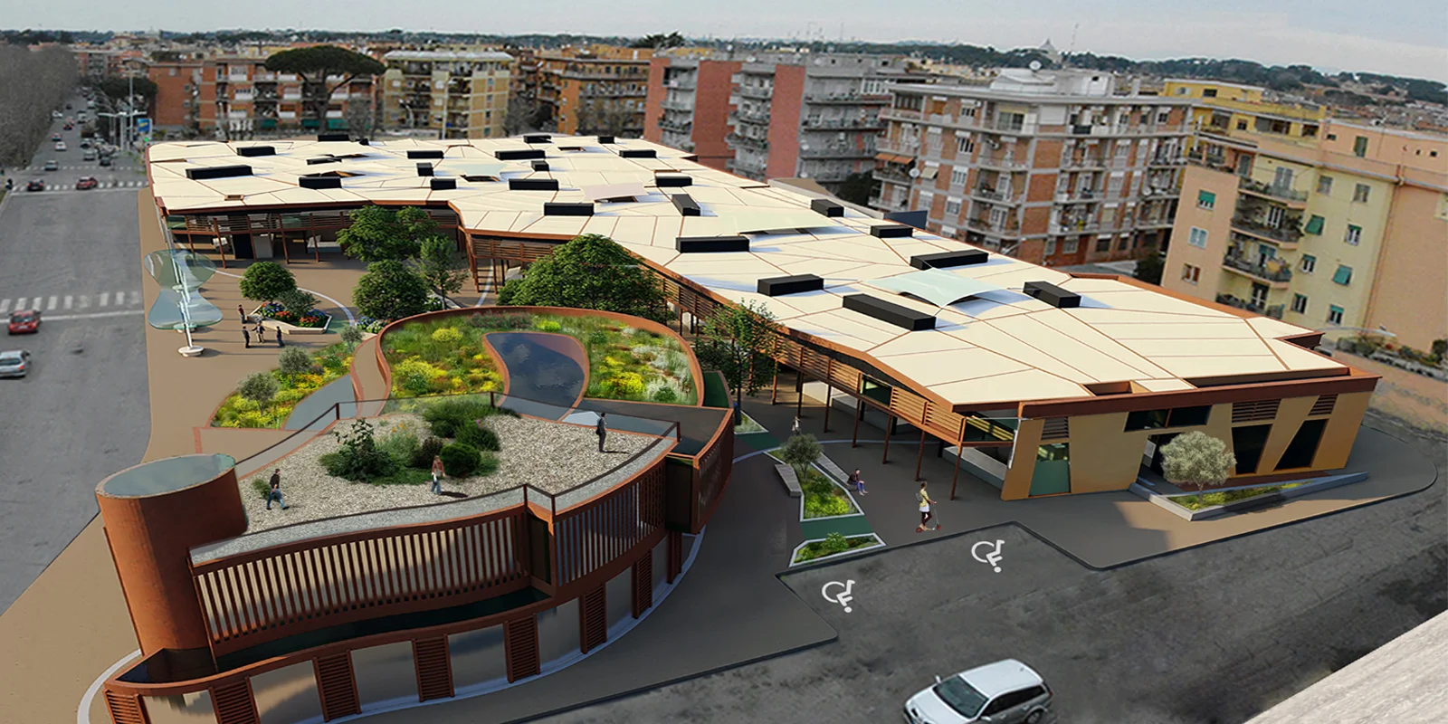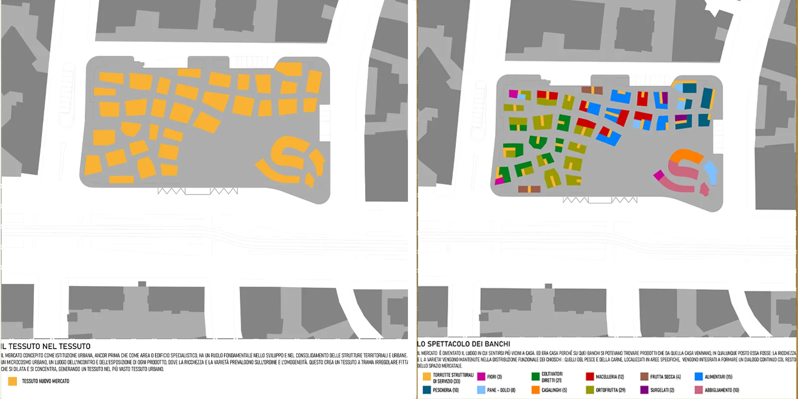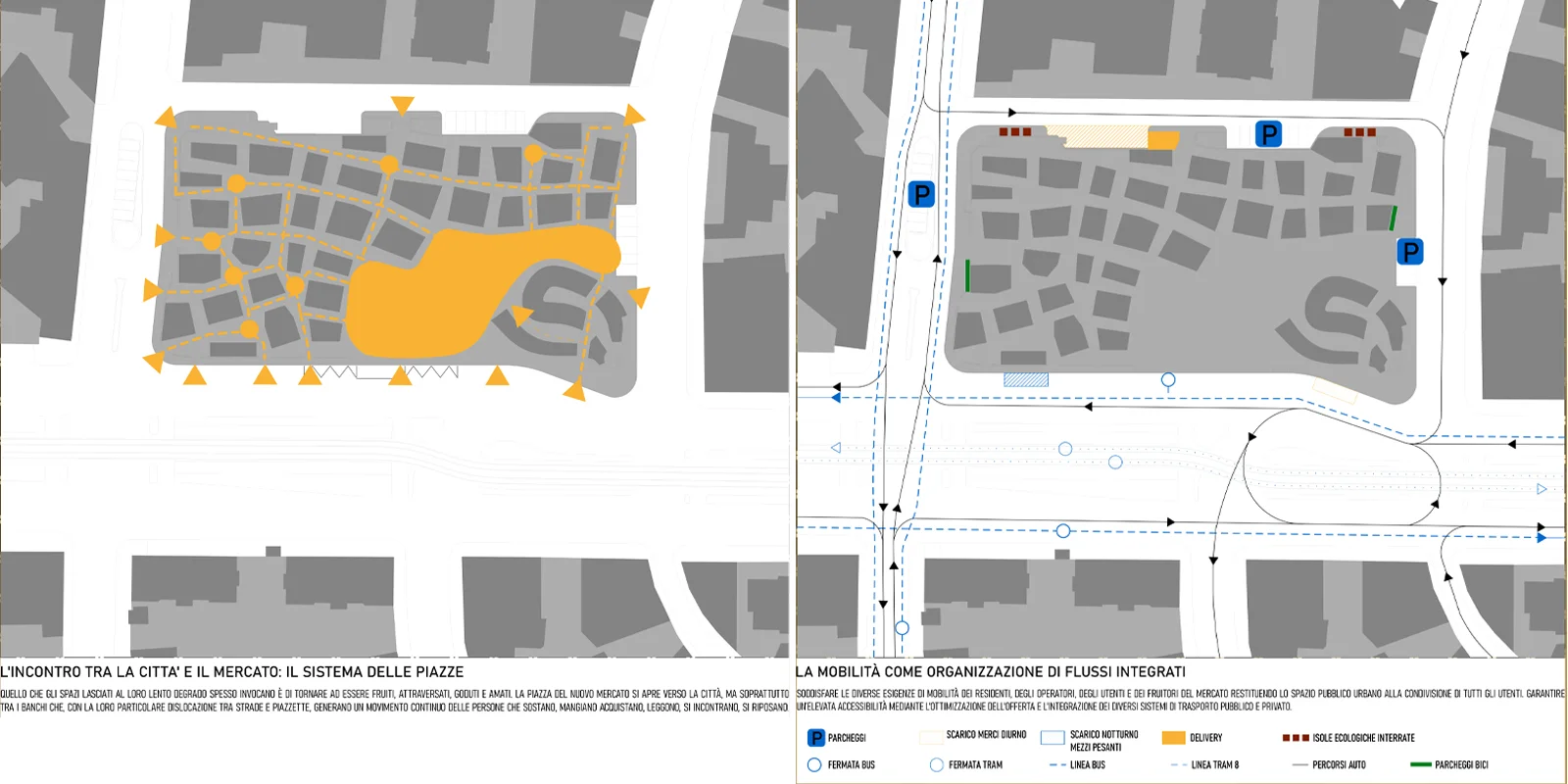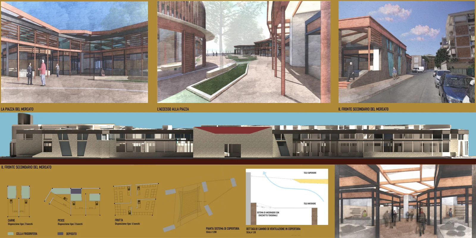 L'idea di organizzare una disposizione degli accessi ed una distribuzione interna estremamente dinamica e fluida, rispecchia la vitalità che questo mercato, ancor oggi, mantiene per tutti gli abitanti del quartiere di Monteverde. Un recinto murario, con grandi tagli dritti e obliqui che determinano grandi vani aperti, sormontato da una grande trave in acciaio corten a cui sono ancorate saldamente le travi della copertura telata piana. I chioschi sotto, dislocati a gruppi, intorno le torri metalliche che oltre a contenere il sistema di refrigerazione delle cabine Frigo, fungono da castello strutturale e ancoraggio per le travature di legno lamellare. Uno spazio resiliente rimodulabile e trasformabile nel tempo.