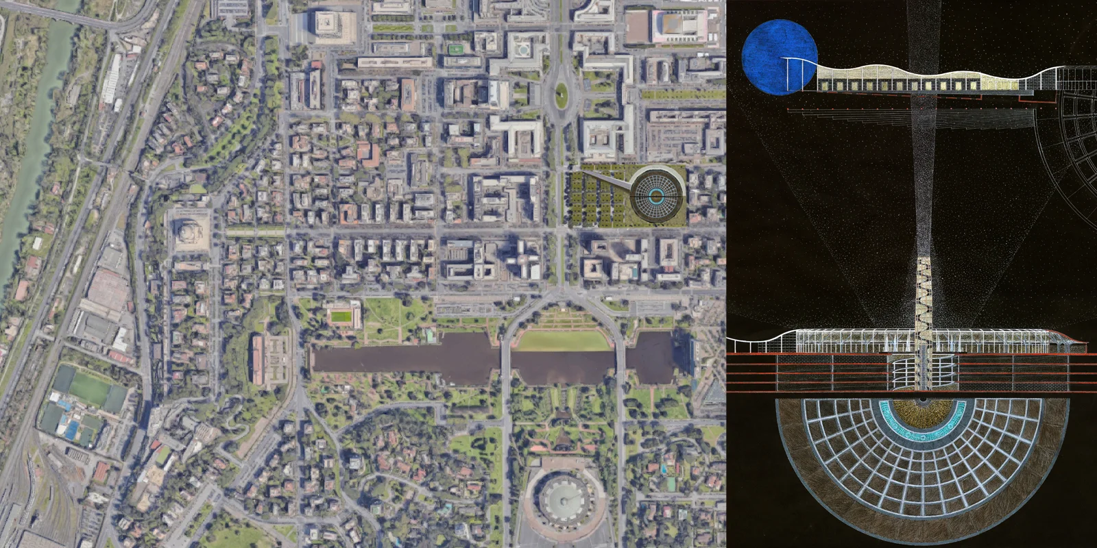 Il progetto interessa la stessa area in cui nel 1998 si svolse il concorso per la progettazione del Nuovo Palazzo dei Congressi di Roma. A 30 anni da questo progetto e alla luce della realizzazione del Nuovo Palazzo dei Congressi: “la nuvola”, terminata nel 2016, ritengo attuale descriverne i contenuti e trarre alcune considerazioni. Il progetto prevedeva un parcheggio multipiano interrato una sala congressi ipogea di circa 2.500 posti con una piazza a raso aperta. Gli unici volumi costruiti fuori terra consistevano in alcuni servizi dislocati intorno alla piazza, un portico e la torre degli ascensori e delle scale che posta nel foro al centrale della piazza, dall'ultimo livello interrato svettava oltre i 40 metri dalla linea di terra. La realizzazione del Nuovo Centro Congressi: costo preventivato 130 milioni, importo dell'appalto 270, costo finale di realizzazione 680 milioni. Importo pressoché quintuplicato, escludendo i costi delle cause ancora in corso. Come sia stato possibile promuovere un'opera così mastodontica - 37 mila tonnellate di acciaio (pari a 5 volte la Tour Eiffel), circa 58 mila metri quadrati di vetro (pari a 7 campi da calcio) - nell'unico spazio libero dell'EUR che ben si sarebbe prestato a essere la piazza-foro del quartiere, non lo sapremo mai. Una montagna di acciaio e vetro per sospendere al suo interno un teatro. Oltre ad avere un costo esorbitante, si tratta di un'opera non tecnologicamente avanzata, in quanto non sfrutta appieno l'energia solare: i pannelli fotovoltaici posti in copertura non compensano il dispendio energetico dell'estesa superficie vetrata, che trasforma l'interno in una enorme serra, fredda d'inverno e calda d'estate, con estreme difficoltà di compartimentazione e quindi di climatizzazione. I costi di manutenzione e di gestione sono altissimi e fanno lievitare i canoni di locazione dei box espositivi, oltretutto gli spazi sono sovradimensionati rispetto alla reale utenza.