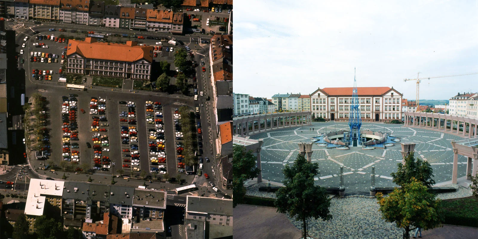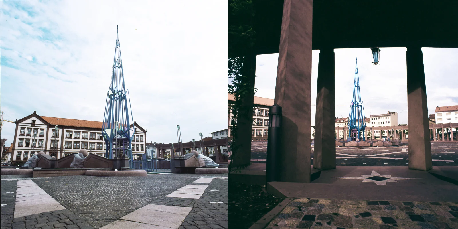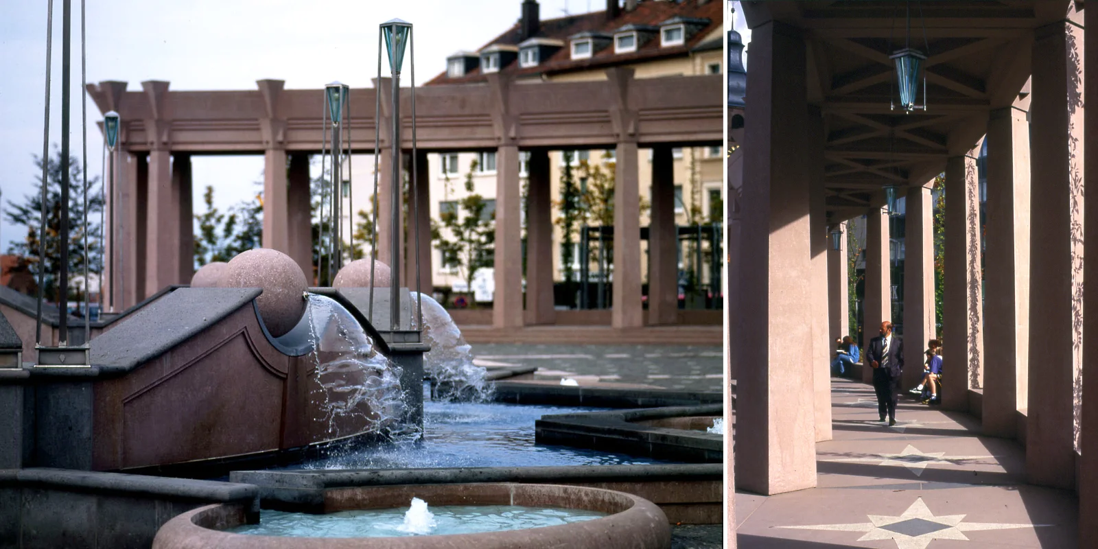 LA PIAZZA DEL MUNICIPIO DI PIRMASENS. Articolo di Mario Pisani in “Materia” rivista di architettura”, anno 8° n. 21, 1996“Si può dire che la bellezza delle città è dovuta alle piazze, le strade si hanno la loro suggestione, ma sono soprattutto le piazze che individuano e fissano indelebilmente la fisionomia della città. Quando poi torniamo con la mente ad una di queste, ne vediamo il volto attraverso le piazze più che attraverso le strade” scriveva Marcello Piacentini nel 1942. È difficile credere che nell'immaginario collettivo degli abitanti della cittadina tedesca, l'Exerzierplatz non diverrà, con il fluire del tempo, l'elemento caratterizzante della città, il volto, ma forse anche il cuore stesso di Pirmasens. Per la sua capacità di evocare un universo fantasmatico ove il mito, ovvero la nostra ombra, amorosamente si salda con immagini reali ed il tutto lancia appelli alla memoria, a quei processi inconsci che permettono la stratificazione delle conoscenze ed il loro riapparire improvviso. Come ricorda Marcel Proust a proposito di Parma o del passo nel vuoto per un selciato sconnesso. La dove fino a qualche anno orsono esisteva unicamente un triste parcheggio, oggi troviamo uno spazio armonico, perimetrato, chiuso come una galleria di quadri architettonici dove gli edifici, ad iniziare dal Palazzo del Comune, vera figura privilegiata perché intesa come la casa comune, tornano ad acquistare il loro decoro e a parlarsi tra loro. Ma, ancora più significativo appare il vuoto, quella sorta di cuscino d'aria contenuto tra questi che modella segni indelebili, elementi di linguaggi diversi che appaiono con sorpresa e meraviglia, invitandoci a riflettere sulla reale ricchezza di concetti e di espressioni linguistiche che possiede la nostra disciplina. Qui troviamo infatti il connubio tra l'obelisco e la torre, ispirato allo studio degli alberi di Paul Klee, che non vuole costringerci a misurare il tempo osservando l'ombra sul pavimento, ma vuole suggerirci di guardare il cielo e notare come i profili delle case si disegnano su di esso. La stessa intuizione che vi era nell'Alpine Arkitecture di Bruno Taut, suggestioni che filtrano nell'immagine realizzata. Scopriamo quindi il portico, questo elemento che non ferma il nostro sguardo impedendogli di andare oltre, dove è piacevole passeggiare osservando le facciate delle costruzioni. O sostare seduti a bere un caffè e guardare la gente passare. Individuiamo infine le fontane con l'acqua che scorre ed una particolare pavimentazione che evoca quella pensata da Michelangelo per la Piazza del Campidoglio. Portoghesi con il giovane architetto Enrico Cerioni ci invitano ad esplorare gli archetipi, a scavare nel profondo, nell'anima stessa per cogliere l'origine e l'essenza delle cose. In questo luogo riacquistiamo il senso della ricchezza del comporre, scopriamo la felicità del mestiere. Comprendiamo infine che tra le tracce che l'uomo lascia su questa terra esiste certamente anche l'Architettura.