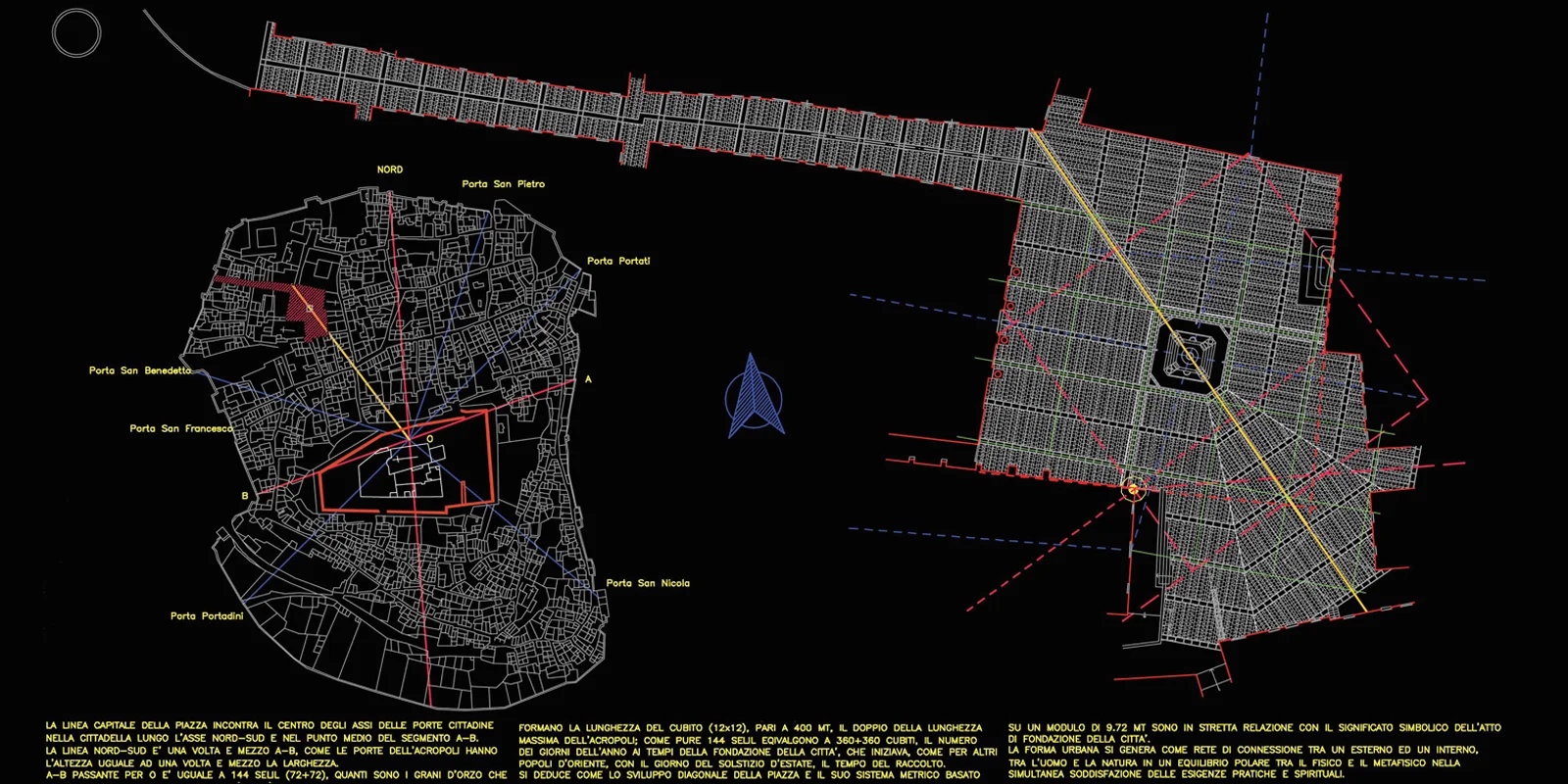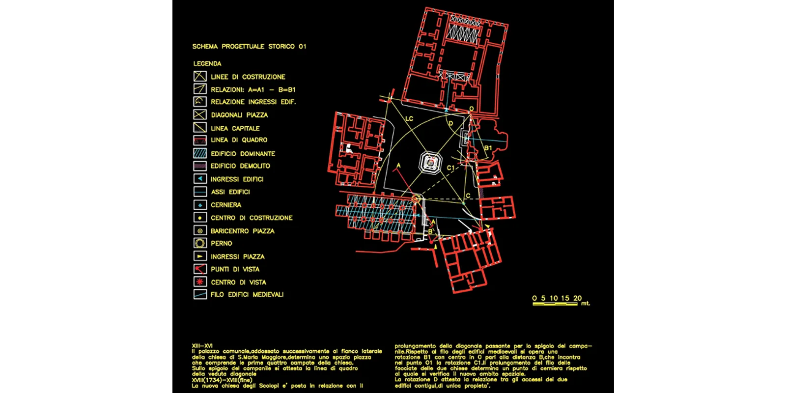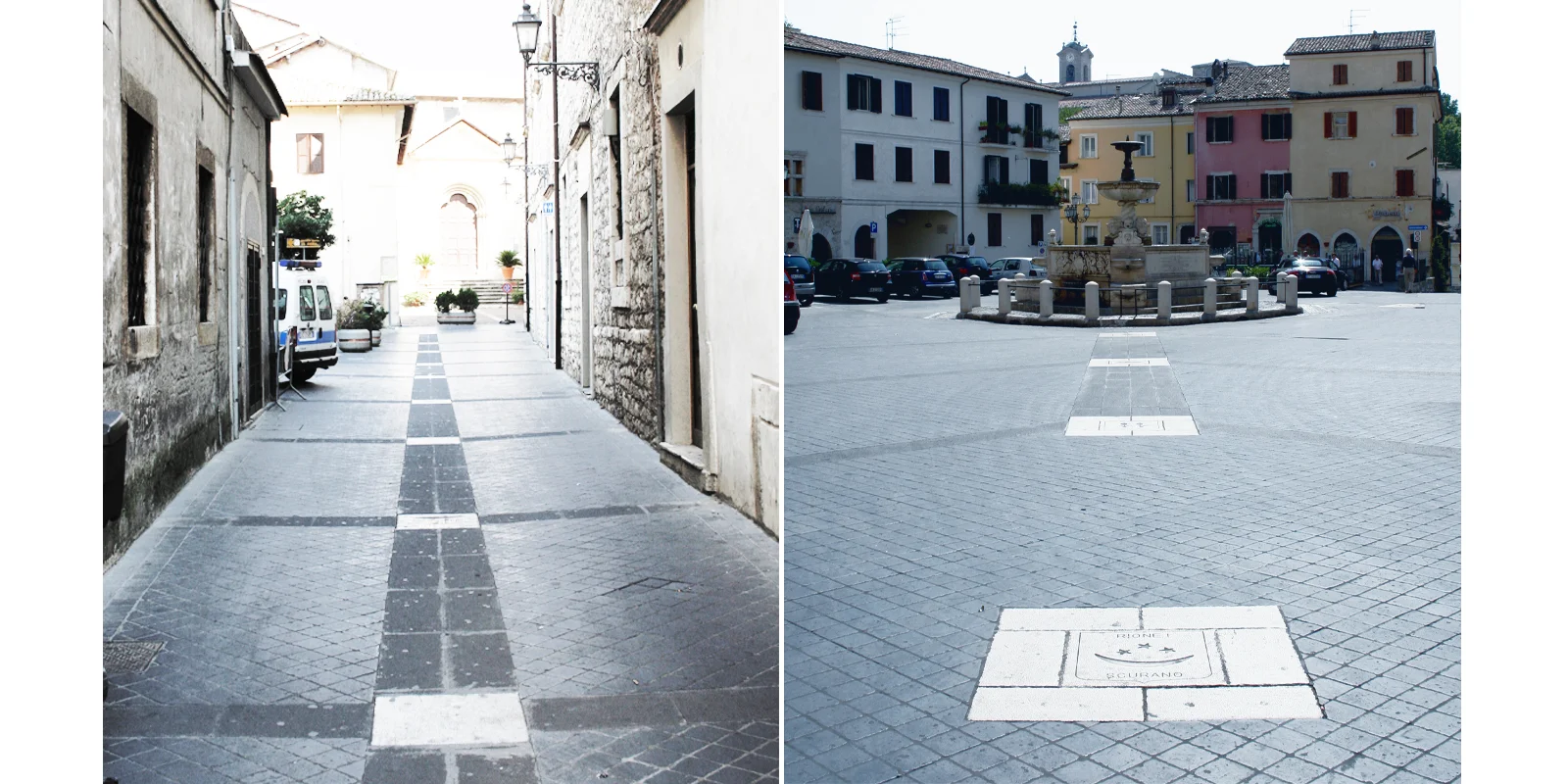Il progetto muove dall'impianto diagonale della piazza per tessere la trama della pavimentazione direttamente da i rapporti metrici che legano le diverse architetture del contorno. In questo contesto i due edifici contigui del Municipio e Conti Gentili segnano l'ingresso diagonale, la soglia oltre la quale ci si trova nell'invaso. Elemento unificante degli edifici la pavimentazione della piazza, sorta di tessuto geometrico, generato dalla suddivisione del modulo base di 9,72 ml, in cui i fili immateriali delle diverse assialità si regolarizzano in fasce di pietra calcare (larghe 60 cm) inframezzate da basaltina messa in opera a correre (per una larghezza di 4,26) in direzione della linea capitale (anch'essa in pietra calcare). La linea capitale in prossimità della fontana Pia si biforca determinando un vasto campo prospettico aperto segnato dai ricorsi di pietra calcare che abbracciano con il loro andamento il sagrato della chiesa di Santa Maria Maggiore e il sagrato della chiesa di Santa Maria degli Scolopi.