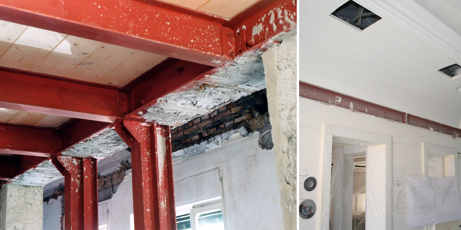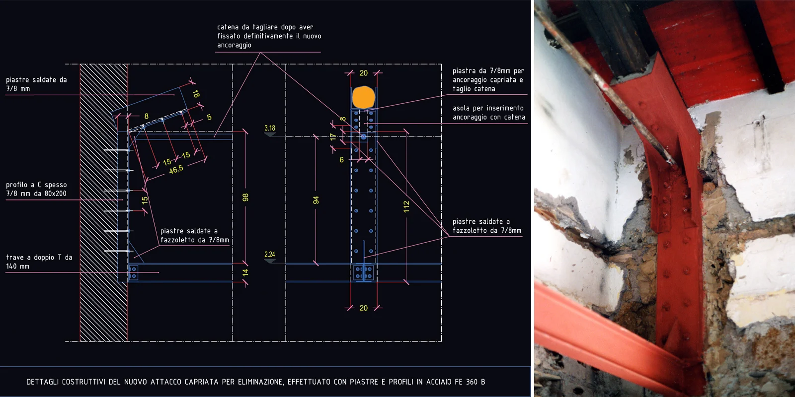 La prima opera ha riguardato l'apertura di tre vani sul muro di spina attraverso la costituzione di una trave a sandwich costituita da due strati resistenti, profili metallici a U distanziati tra loro e collegati rigidamente ad un elemento connettivo, in questo caso il tufo. La struttura così composta ha un comportamento statico notevolmente migliore delle singole parti da cui è costituita. La seconda opera ha interessato le capriate con il relativo taglio delle catene. Taglio che ha comportato la realizzazione di staffe a camicia nel punto di appoggio delle capriate, collegate alla catena ribassata alla quota del nuovo livello del soppalco.