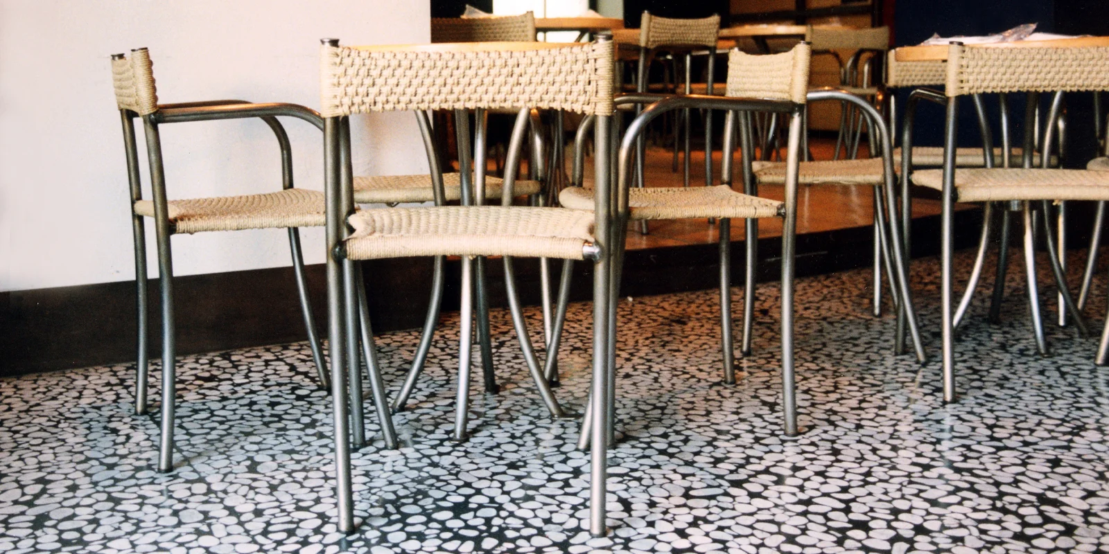 Le projet s’inspire des rives sinueuses du Tibre, à quelques pas du Café, recréant — à travers une ligne courbe continue, libre dans l’espace — une atmosphère de taverne marine hors du temps.