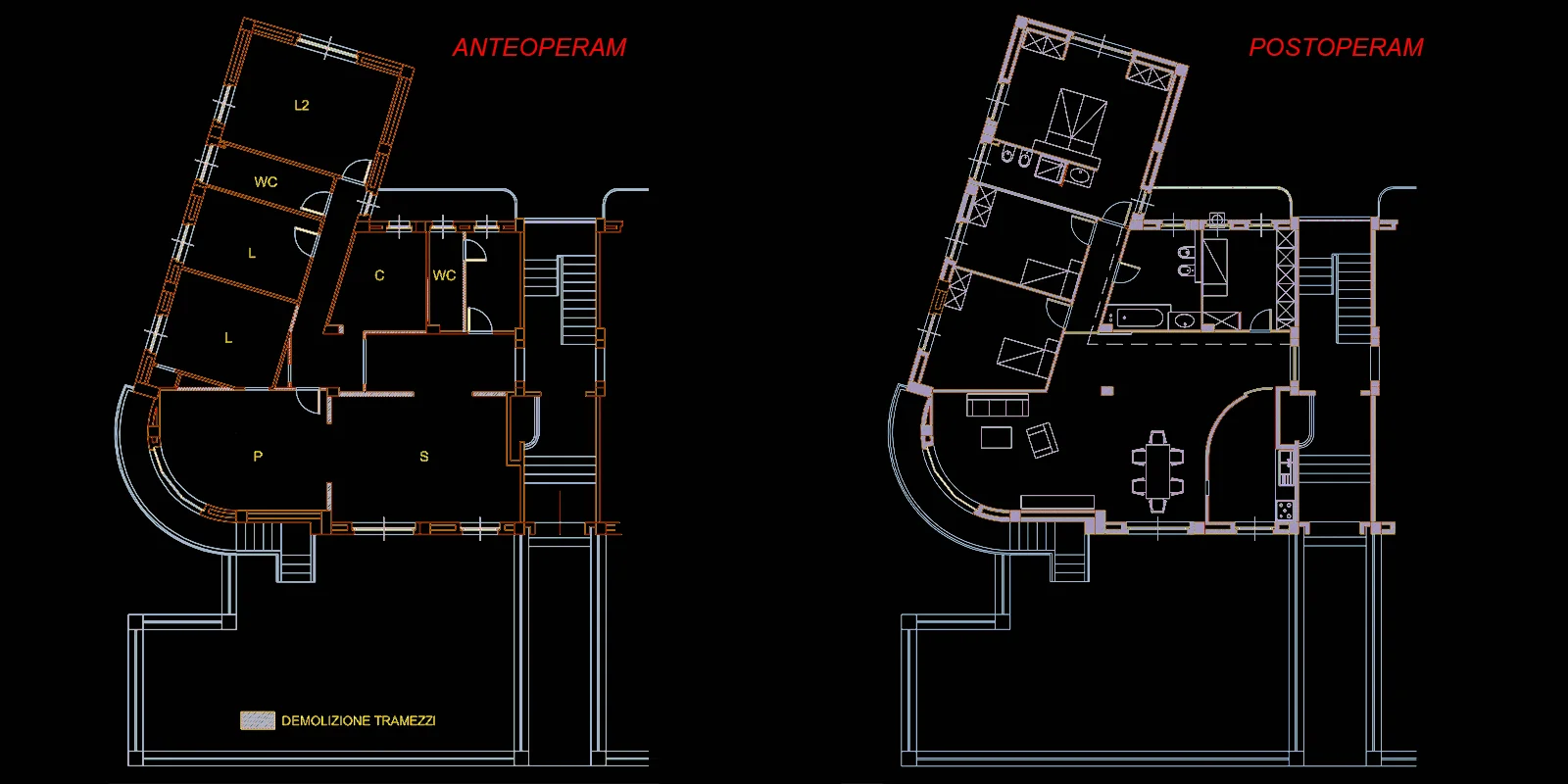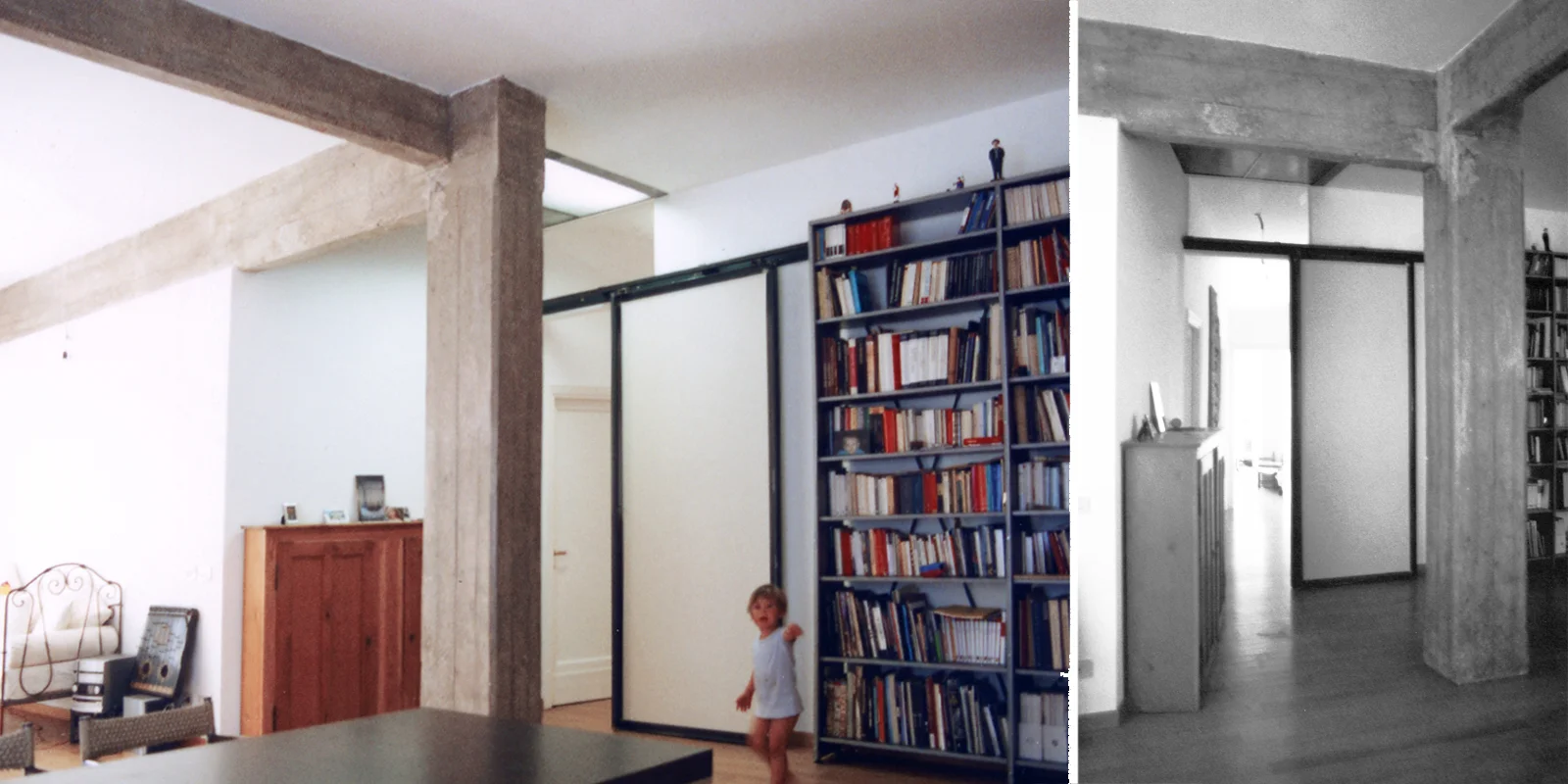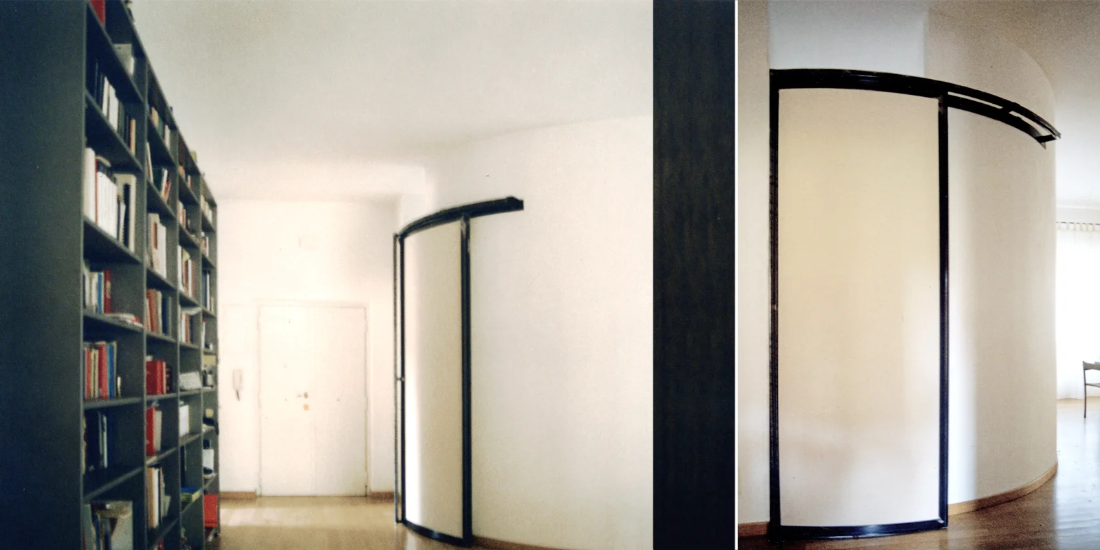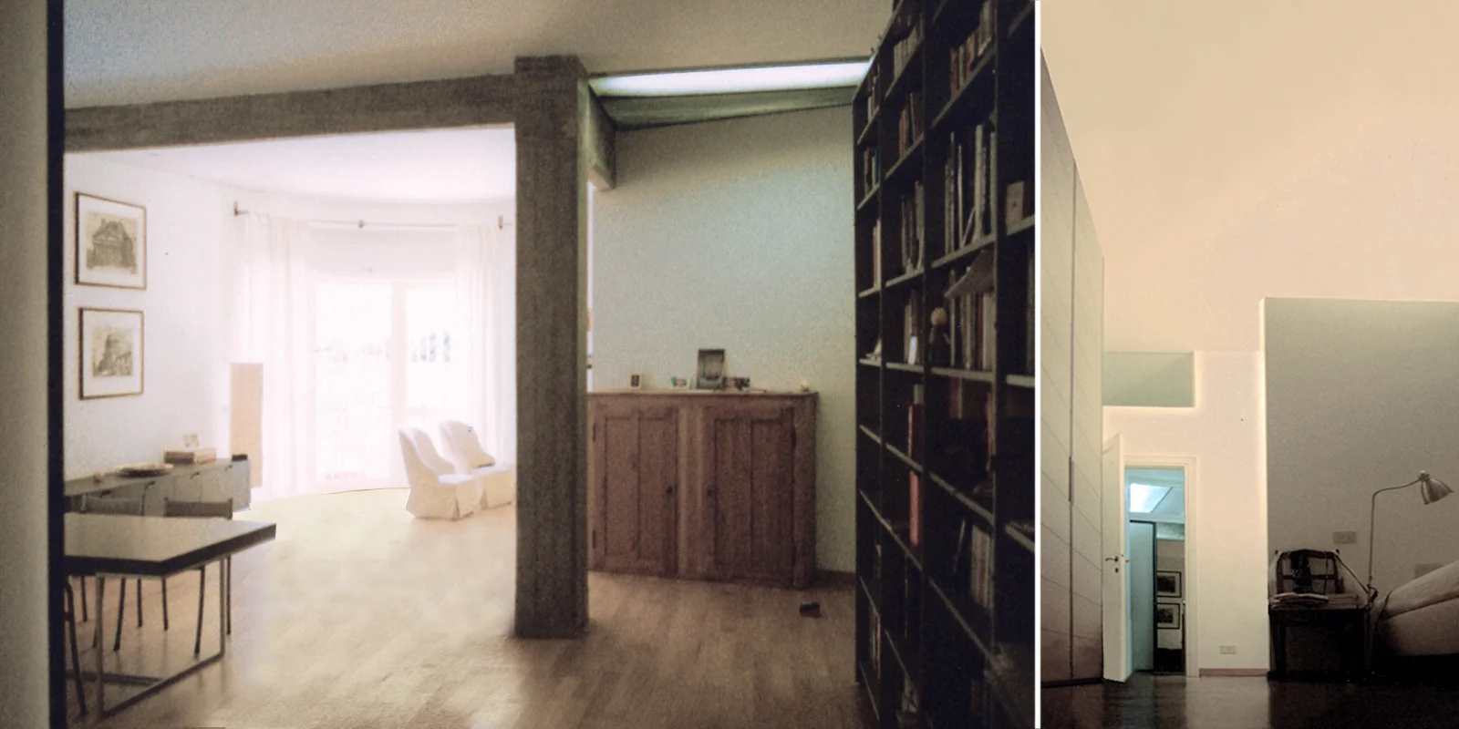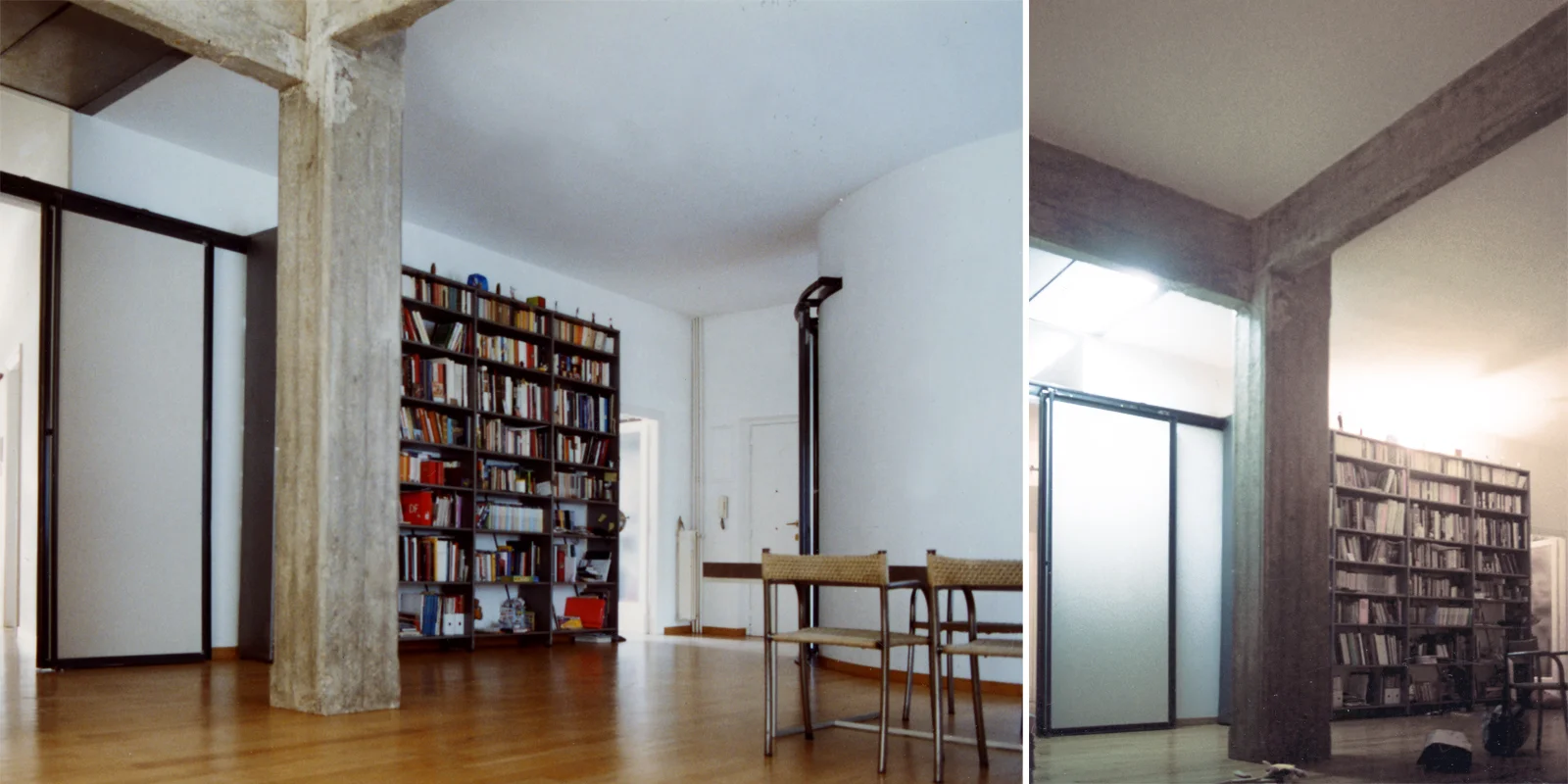 Lo spazio nasce da un pilastro di c.a. armato messo a nudo e una curva bianca di muratura. Da qui inizia la corrispondenza dei termini che definiscono lo spazio. Le porte, a telaio/telato, scorrevoli su guide esterne a vista, di cui: una curva (ingresso cucina) ed una retta (ingresso zona notte). Una libreria in lamiera fine di ferro tagliata, piegata e assemblata in moduli rettangolari. Un lucernario con diffusore a rete: fine e fitta di metallo, tagliata e assemblata su profili di ferro. Le sedie del Caffè dell'Angelo nella tavola da pranzo. I piani e le linee della distribuzione degli spazi