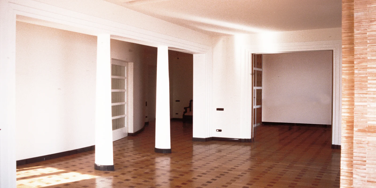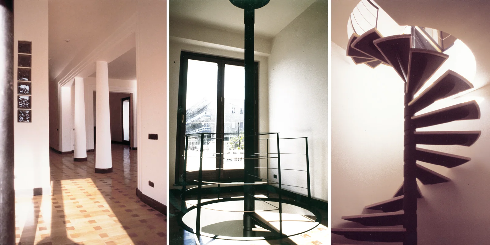 Lo spazio è concepito come un arco (il muro che separa la cucina dalla zona giorno), in procinto di scoccare le frecce (le due colonne a mandorla) verso l'orizzonte marino. Un camino, in mattoncini di cotto, bordati alle estremità e sull'architrave della bocca, con piperno finemente bocciardato, si erge solido tra due porte finestre scorrevoli che danno accesso alla balconata sul golfo di Napoli. Un tappeto di geometrie quadrate di legno scuro e chiaro è la pavimentazione, così come il mobile della sala pranzo di legno e vetro scannellato. Una porta scorrevole a scomparsa di rovere e vetro, collega il pranzo con il soggiorno. Delle modanature rettilinee a fasce continue segnano le grandi aperture di comunicazione dello spazio. Una scala elicoidale a sbalzo in struttura di piastre di ferro tagliate e sagomate inanellate su palo in tubolare di ferro con pedate in tavole di rovere tagliate e assemblate.