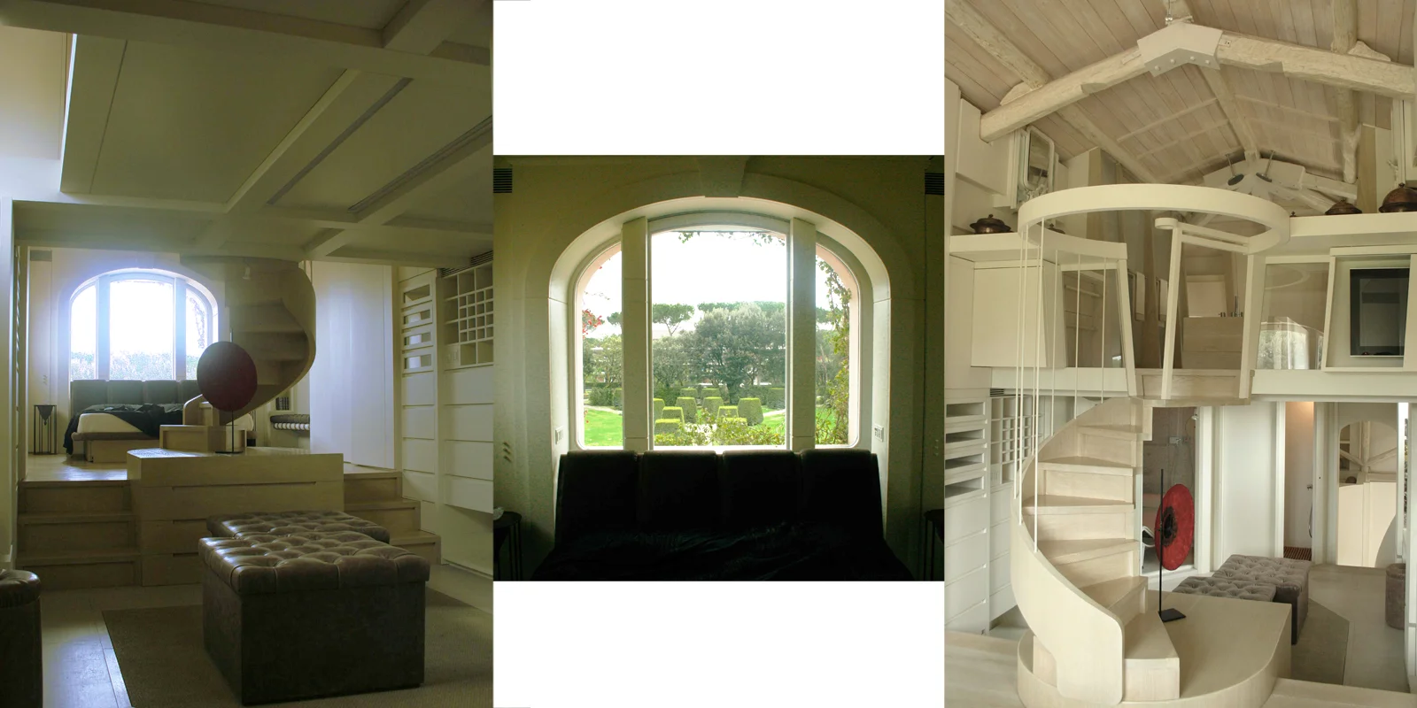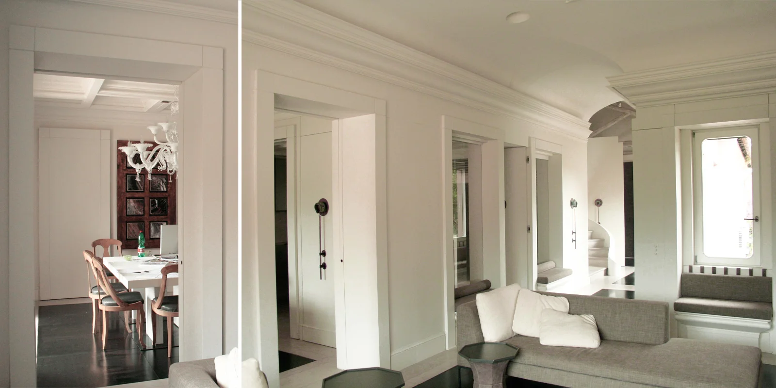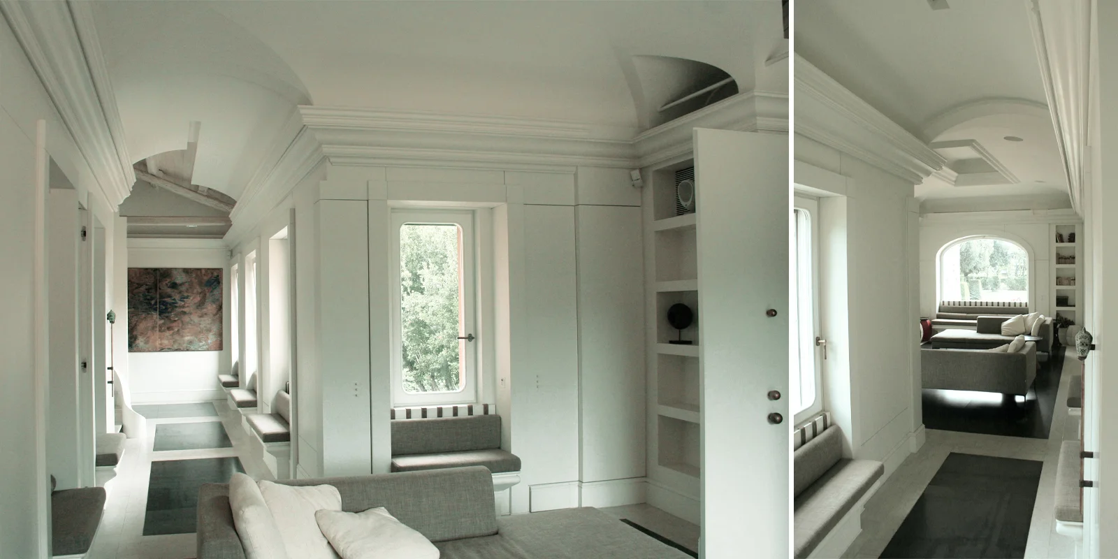 L'intervento si caratterizza per la dialettica tra involucri diversi: il primo quello della pelle originaria del manufatto in cui sono percepibili le strutture originarie lignee, il secondo il nuovo guscio, creato all'interno, classico e sobrio, ispirato dalle linee decorative delle modanature esterne e dal giardino all'italiana prospicente la villa.