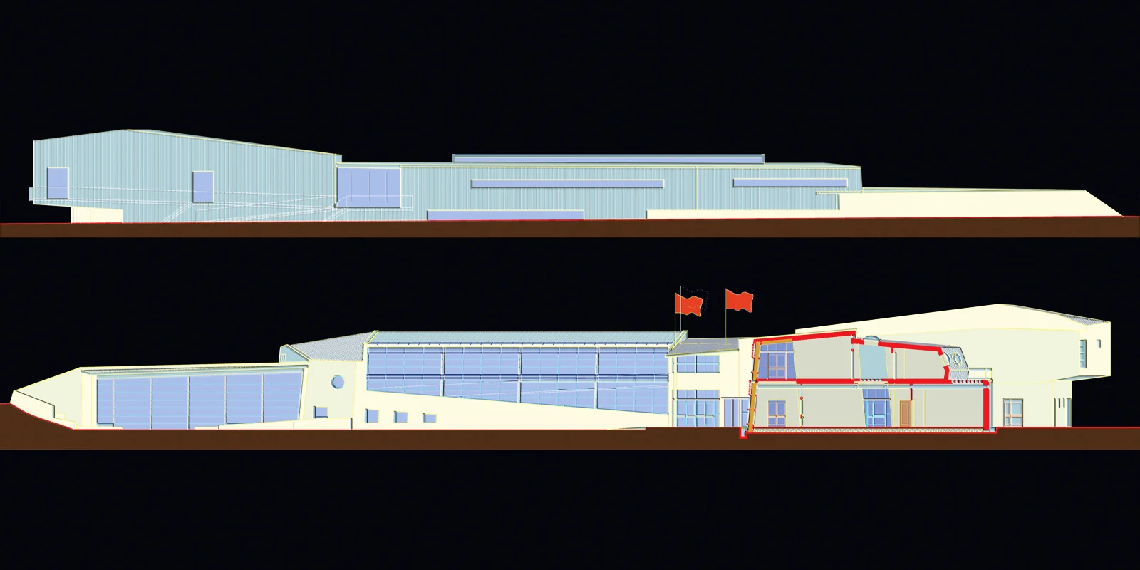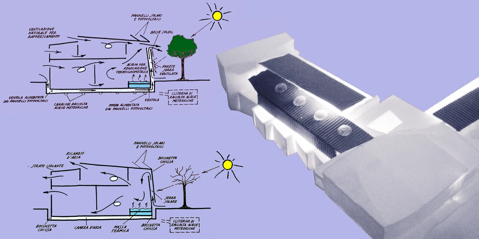 L'architettura in un contesto frammentario cerca il radicamento con la morfologia del sito: ai piedi di una collina dolcemente degradante a valle. La conformazione del lotto trapezoidale ha consentito di sviluppare la costruzione sui due lati Nord, Est. Questo, oltre a preservare l'area centrale a giardino, area giochi e parcheggio, ha consentito di distribuire le aule e i laboratori verso Sud e Ovest, attraverso gallerie vetrate, vere serre con dispositivi automatici di regolazione dell'ombreggiamento, che funge da termoregolatore con l'ausilio di piante e vasche d'acqua. Le vetrate sono stratificate di sicurezza atte a contenere le celle fotovoltaiche.