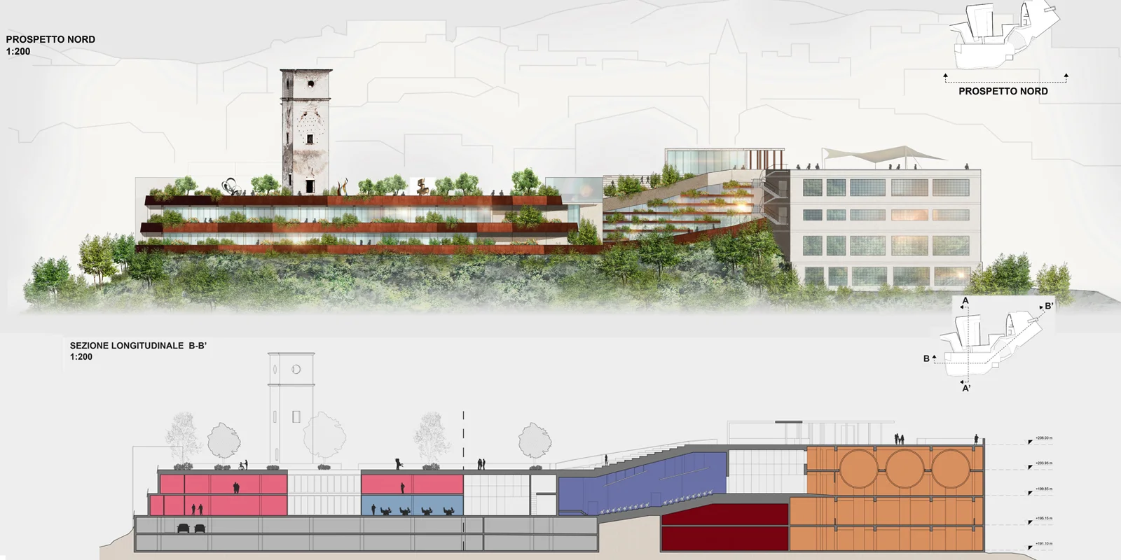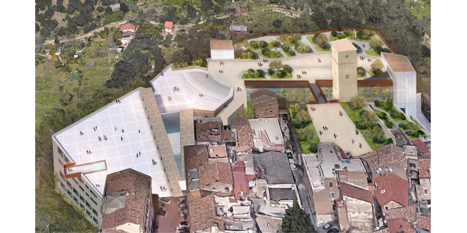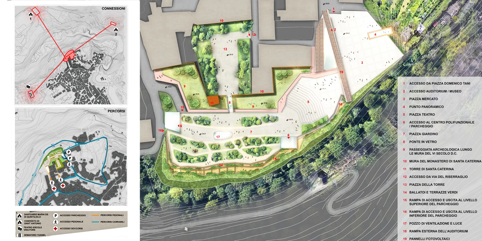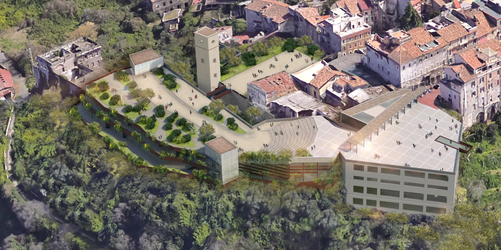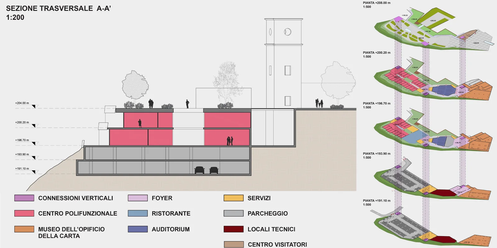 Il manufatto della ex cartiera e ubicato nel margine Nord Ovest del centro storico di Tivoli. L'orografia si presenta: prima sotto forma di scarpata, poi in pendenza sino al bacino idrografico del fiume Aniene, per poi risalire nel versante collinoso opposto. Il progetto cerca di rimarginare quella frattura creata, nella morfologia del declivio verso la riva sinistra del fiume, dal fronte continuo della cartiera costruito negli anni ‘50. La sua demolizione è motivata non solo dal punto di vista del suo stato strutturale altamente degradato e non congeniale alle nuove funzioni, ma in virtù della possibilità di creare un nuovo fronte terrazzato a sostruzioni, per riconnettere i margini della città storica con il paesaggio e recuperare la relazione con l'orografia naturale e la vegetazione tipica del bacino idrografico dell'Aniene. La qualità architettonica di un intervento si misura con la capacita di instaurare un rapporto con il particolare contesto storico, ambientale culturale in cui lo stesso si inserisce. In questo caso specifico la nuova architettura è un segno di margine che si relaziona simultaneamente da una parte con la scala territoriale e paesaggistica e dall'altra con la più intima scala urbana dove il segno è l'espressione della vita nello spazio pubblico di una comunità nel tempo presente. Si conforma in questo modo uno Spazio Pubblico Continuo di cinque piazze integrate con differenziate funzioni: La Piazza Mercato; La Piazza Teatro; La piazza Giardino; La piazza Torre. Al di sotto del sistema di Piazze si sviluppano da una parte: il Parcheggio sui primi due livelli inferiori, nei restanti due: una struttura ricettiva e all'ultimo livello spazi polifunzionali e di servizio. L'Auditorium sorge dove la frattura della frana provocò il crollo. Un nodo strutturale di consolidamento geo-morfologico considerevole, che viene affrontato, con una gabbia/giunto, macro-strutturale in acciaio corten, fondata su gruppi di micropali legati tra loro con dispositivi antisismici. Oltre si giunge nella parte originaria della Cartiera e delle sue stratificazioni temporali, qui il restauro e il consolidamento sono una trama Piranesiana di passaggi, ballatoi, ponti passerelle in legno e ferro zincato cerato che accompagnano il visitatore alla fruizione del museo della carta, con una sezione Multimediale e interattiva.